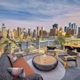 Boutique Kimpton hotel steps from the terminal — rooftop bar with Hudson River views