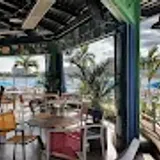 Open-air waterfront dining with shipping container food stalls, Lighthaus beer garden, and live music steps from the port